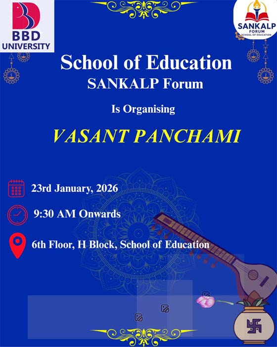 By admin Posted January 23, 2026 In Event SOED, School of EducationBASANT PANCHAMI2026-01-232026-01-23https://bbdu.ac.in/wp-content/uploads/2024/09/bbdu-logo.gifBBDUhttps://bbdu.ac.in/wp-content/uploads/2026/01/230126.jpg200px200px Date- 23rd January 2026 Time- 9:30AM Onwards Venue- 6th Floor, School of Education, BBD University